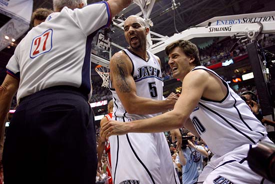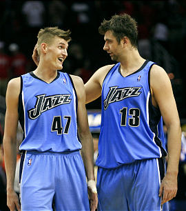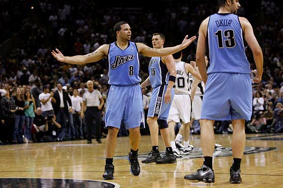 所以Kirilenko在外線持球時會四顧心茫然,說到底終究是他的屬性(他的球路與他的才藝)根本就不適合做大前鋒以外的事啊!更有甚者,雖然在傳統籃球思維上小前鋒與大前鋒的同質程度較高,但在爵士隊真不巧,這兩個根本是大相逕庭的概念啊! 所以,原始設定上同中有異、異中有同的大前鋒與小前鋒,在進入爵士系統之後因為任務的分化與精緻化,而使得他們的共同點只剩下「前場工作」一項,而相異程度卻是越拉越開了。 大前鋒繼續待在前場,繼續在低位「左右」活動,而被提高為進攻核心;小前鋒則因其機動性而特化為全方位的配角,不過就算是配角中的王者,還是配角。
