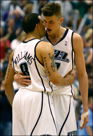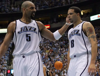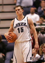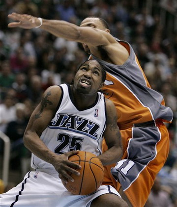 坦白說在目前爵士隊陣容中,優秀的大前鋒有點「過多」了,但「真正合用」的小前鋒嚴格說起來只有Matt Harpring一人。 Harprong球風紮實強悍,能投外線,能在籃下攪和,能自行運球撞開一條血路,上籃流暢穩健,而且能夠做好許多髒活細活,使得他可以頂先發,也可以打替補,可以扛主力,也可以勝任第六人。 這樣子的人物,才是爵士隊側翼組最合適的人才----這裡指的不只是他的球技,而更指的是他的心態,他成熟而踏實,做什麼像什麼,交給他什麼工作,就做好什麼工作,不求個人的數據表現,而只妥善完成任務,所以他成為總教練Sloan的愛將,成為爵士隊運轉順利的關鍵最佳第六人,也成為爵士系統側翼組一個最稱職的典範。