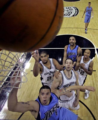 我們繼續假設側翼組們還是一樣「訓練有素」,他們心思機敏,跑動勤奮,覷準機會繞出去拿到球。不過在他們拿到球的瞬間我們有兩點事項要注意:一個是前面一再提及的「擴大空檔」方針,另一個則是總教練Sloan對籃下攻勢的偏好。 於是,雖然你在外線空檔拿到球了,但如果你不是Hornacek,而你卻出手了,這時根據爵士系統精神以及Sloan的價值觀,你恐怕就會很「值得商榷」了。 Giricek,就總是如此這般地進入「商榷名單」中。而Kirilenko,嗯,根據Deron的說法,這種情況下他如果看到加時勤練的Harpring與練完球扭頭就走的Kirilenko同時繞到空檔點上,他當然會選擇把球傳給Harpring啊!