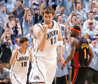 不過這個調整的思路雖然理性而正確,但也確實沒有考量到人類心理層面一些細微的東西。簡單來說,Kirilenko是「曾經滄海難為水」了。 他曾在長人組中享盡主將級的資源,也確實提供出明星級的貢獻,沒想到「橫空出世」了兩個火力強大的Boozer與Okur,令得他不得不退出最順手也最風光的大前鋒位置。 而且Kirilenko還不像Okur一樣:Okur有頂到中鋒的能力、還有堪稱爵士全隊最可靠的外線能力,所以雖然在進攻的重要性上不如Boozer,但還是總能分到好些球來投。 Kirilenko外線沒Okur行,在內線取分又沒Boozer行,更不巧的是他的「第二位置」是小前鋒,而更更不巧是爵士隊的小前鋒與大前鋒雖然只差一個字但是在任務分配上卻是差了一整組,所以Kirilenko適應不良,抑鬱難伸,抱怨連連,也就情有可原了。
