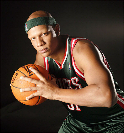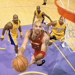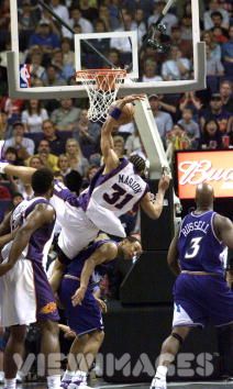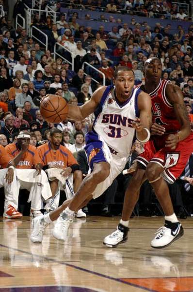 Shawn Marion 對,就是他,就是今年夏天與Kirilenko傳出「互換緋聞」的太陽隊Shawn Marion。 他在太陽隊是打大前鋒,這點毫無疑問,雖然低位單打不是他的球路主軸,但真要他在禁區拿球攻擊他是可以勝任的。而他在防守時的前場傾向更明顯,除非對手鋒衛線上有特別難纏的人物需要他來特別照料,否則一般情況下他的防守站位是較偏向內線的。 也就是說,他雖然「有能力」在外圍纏著那些鬼怪級的前鋒滿場跑,但他主要任務是定位在禁區與那些長人卡位爭籃板,並還真的取得不錯績效。好吧,那在這邊我們就承認他是大前鋒。 而除此外,沒有人會懷疑Marion外圍遊擊的能力,他能投外線,能空切跟進,有必要時還能在攻守轉換時持球側應,機動力極強,腳下工夫靈活。簡言之他能夠很自然地從三分線外「往前」到禁區,而在這「往前」的步驟上他就能產生破壞。 諸如此類,這些都是一個優秀小前鋒才會具備的高招。Marion除了自行持球切入這點比較少見以外,他實可說是一個標準的「大型小前鋒」,這樣的技藝,勝任爵士隊側翼工作絕對綽綽有餘。