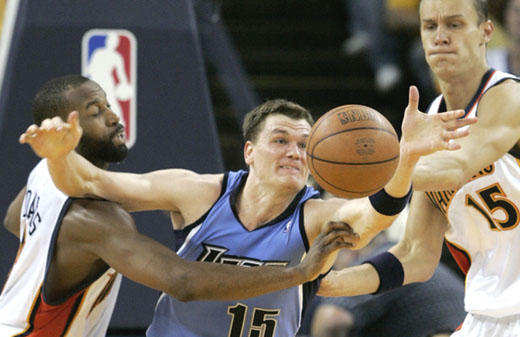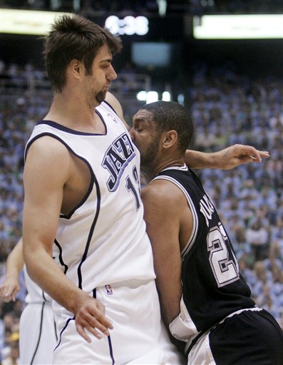 不過Harpring外線倒還不錯,曾進過一次170俱樂部。不過他算不是算是大前鋒呢?我覺得也不能算,因為他的低位動作並不典型,並不真正具備一個職業等級的內線球員該有的禁區腳法。 話說到此,不禁又令人想到爵士隊的中鋒Okur。 Okur是上季爵士全隊三分球出手最多、命中最多、命中率第二高的傢伙,然而他卻是毫無疑問的「長人組」成員。 乍聽之下,還真是荒謬,不過其中理路,倒也不是無跡可循:一方面是他不具備後場球員該有的對球控制力,另一方面是他在內線的腳步完全就是正牌禁區球員的工夫,所以我們都說Okur是「會投三分的中前鋒」,而不說他是「能在禁區廝混的鋒衛」。